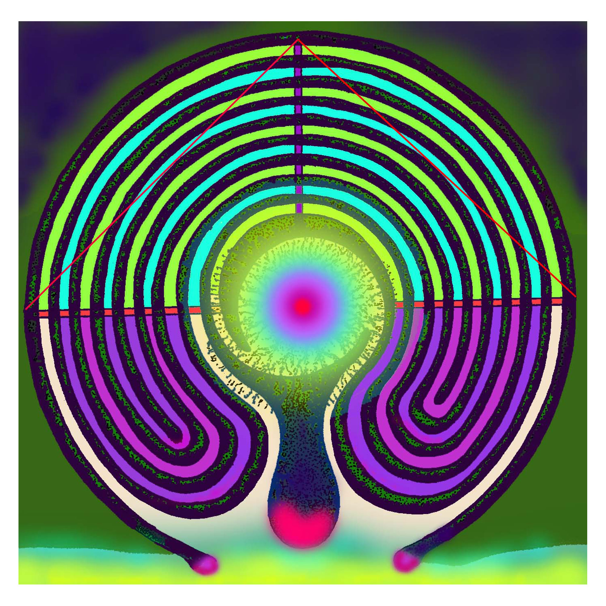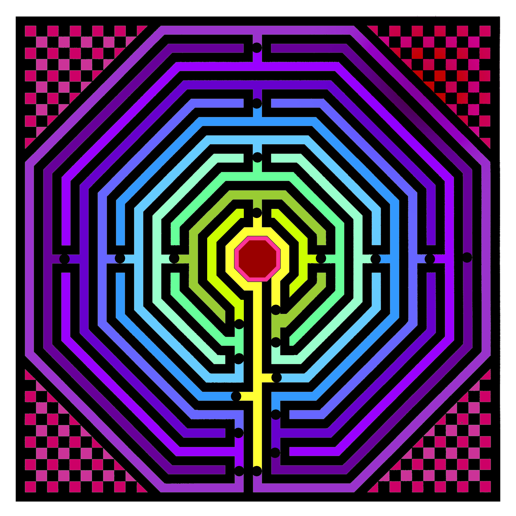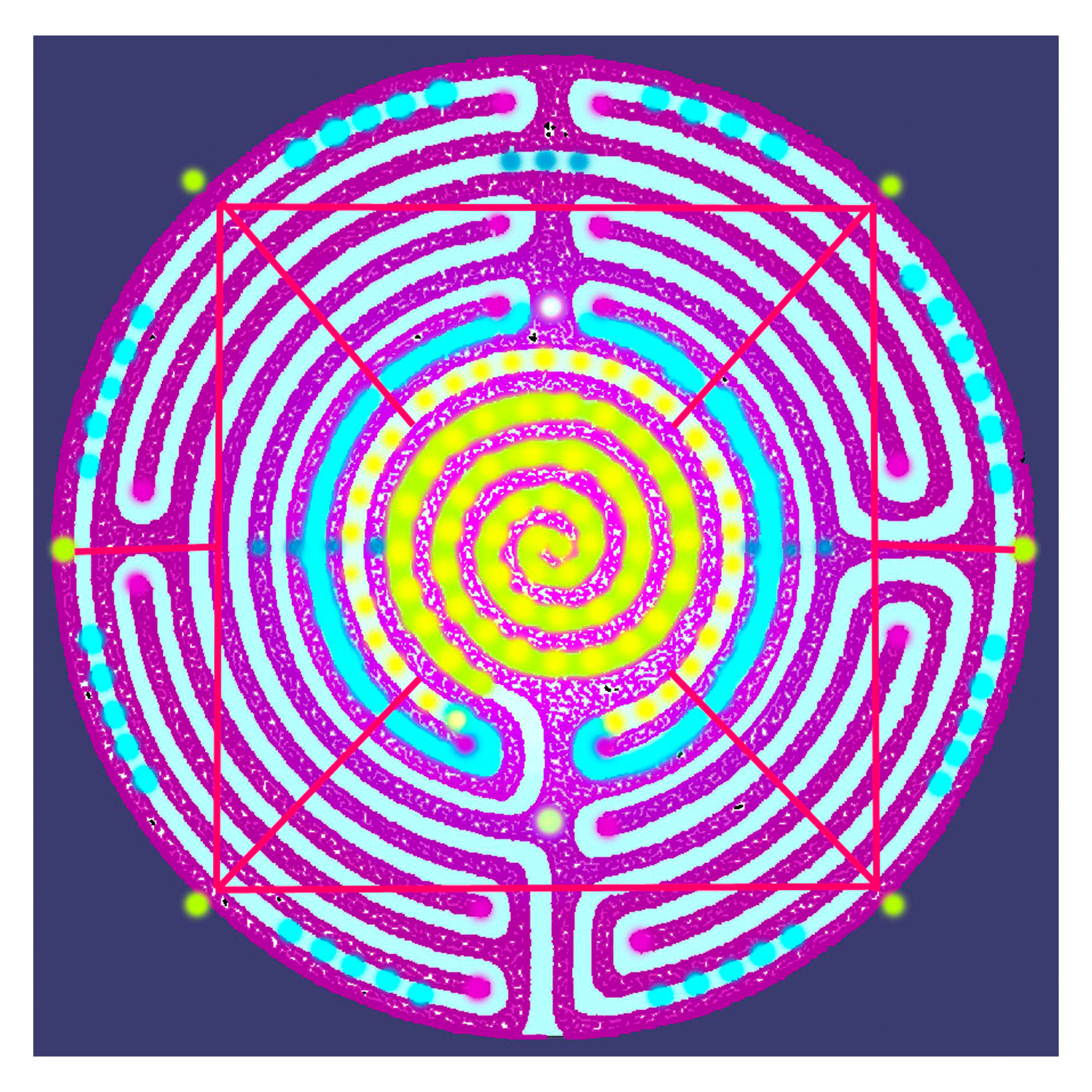 A black and white linear diagram of each labyrinth was reproduced with permission by Jeff Saward from his book Labyrinths & Mazes. I was taken by his diagrams of the historical archaeological sites and corresponded with him in England. I selected several images I wanted to work with and he sent them to me on a CD. My intention was to use them as collage elements in paintings. When I opened the images on my computer in Photoshop, I automatically began adding color, which altered some of the original forms; I then saw them as unique images. These experimental pieces are printed 12 x 12 inches on archival paper and are available as a limited edition of signed and dated prints. They have been included in several exhibitions in New York State.